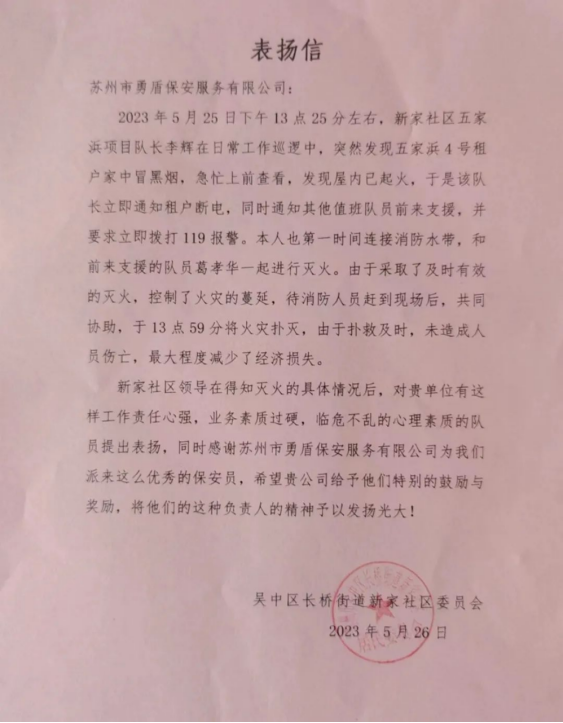 得知情况后,长桥街道新家社社区委员会特意给勇盾保安提出表扬并送来了《表扬信》,遭遇火情的住户同时送来锦旗以示感谢。